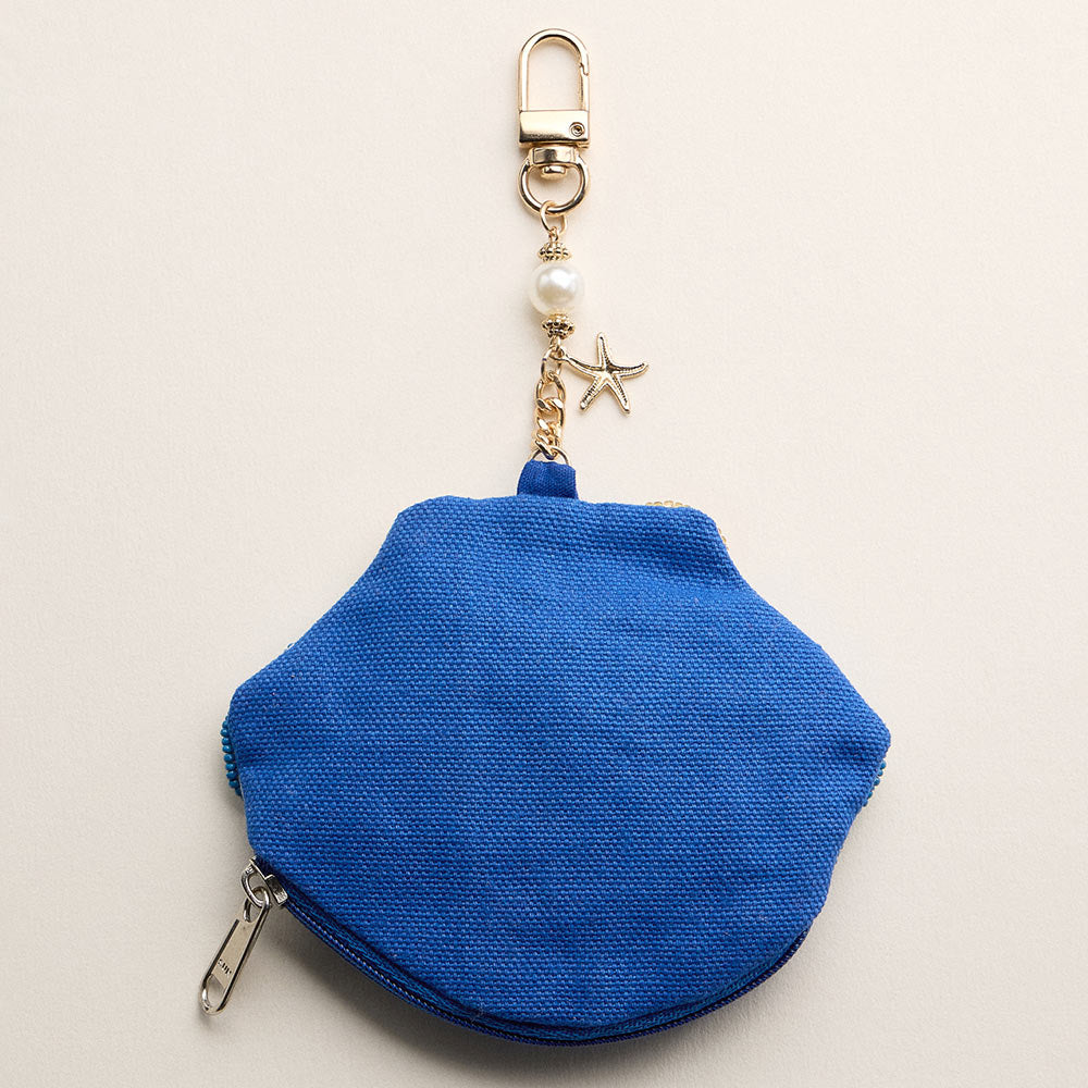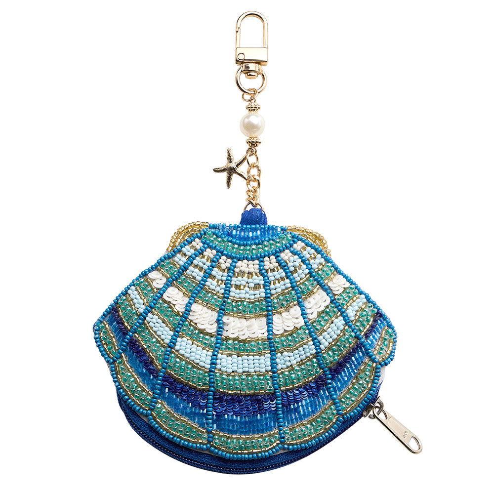 Decorative shell design zipper pouch with keychain clip, ideal for coins, earbuds, cash, or small essentials. Compact and lightweight for handbags or backpacks, perfect for gift shops, beach themed assortments, summer displays, and everyday on the go organization.