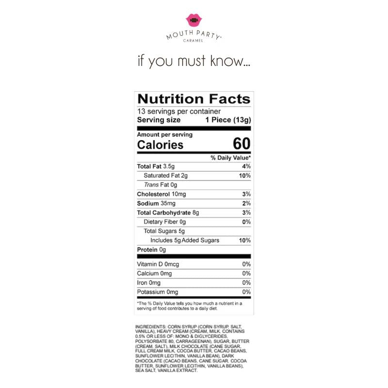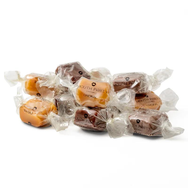 Gotta have it all? Of course you do…Mouth Party's assorted package includes their best-selling caramel flavors: original, sea salt, chocolate sea salt, and OMG! caramels. All of the decadent treats are made in small batches right here in Maryland. The 6 oz bag comes with a bow and ready to gift. It contains approximately 14 caramels.