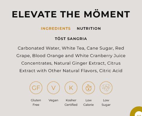 New!  TÖST Sangria is delightful and refreshing, and great to keep on-hand to celebrate any occasion. With sparkling white tea, cranberries and blood orange, it has a beautiful all-natural red hue that feels special.