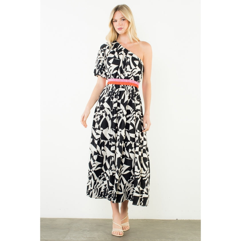 Glide across the room in this beautiful dress. This dress features an elasticized single-shoulder neckline with a short sleeve. The ultra-flattering elasticized waistline is highlighted by pink and orange stripes, leading to a chic tiered midi-length silhouette. The dress is lined through the seat for added comfort. We can't get enough of the unique details that make this piece truly special!
