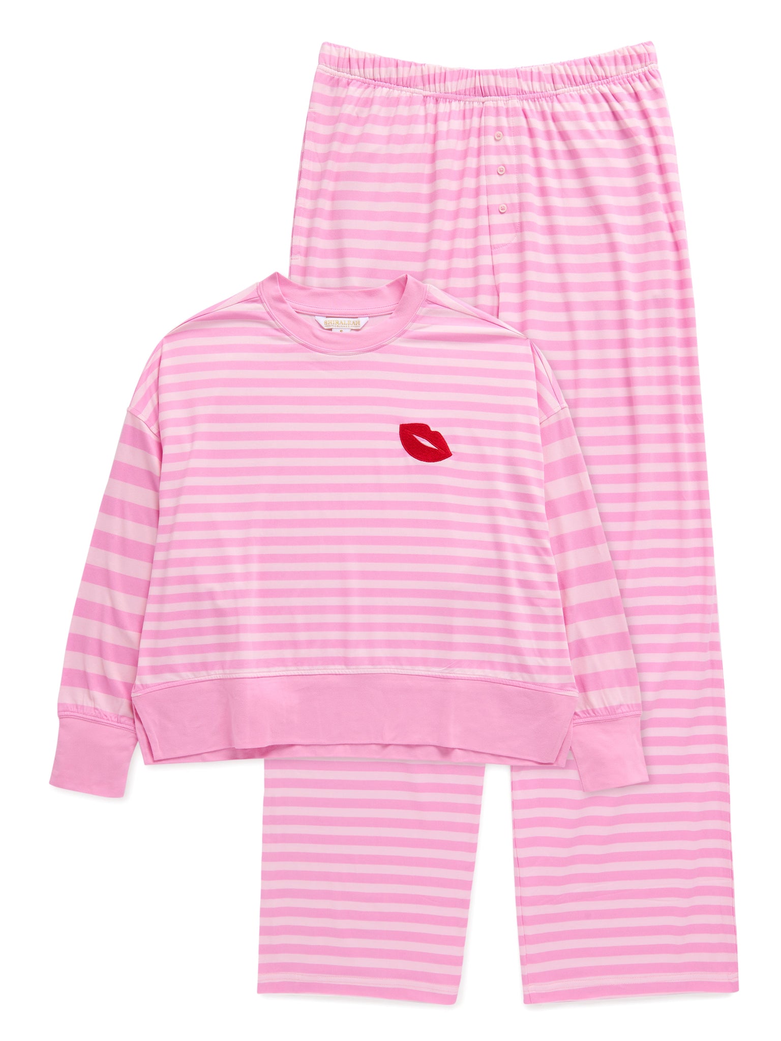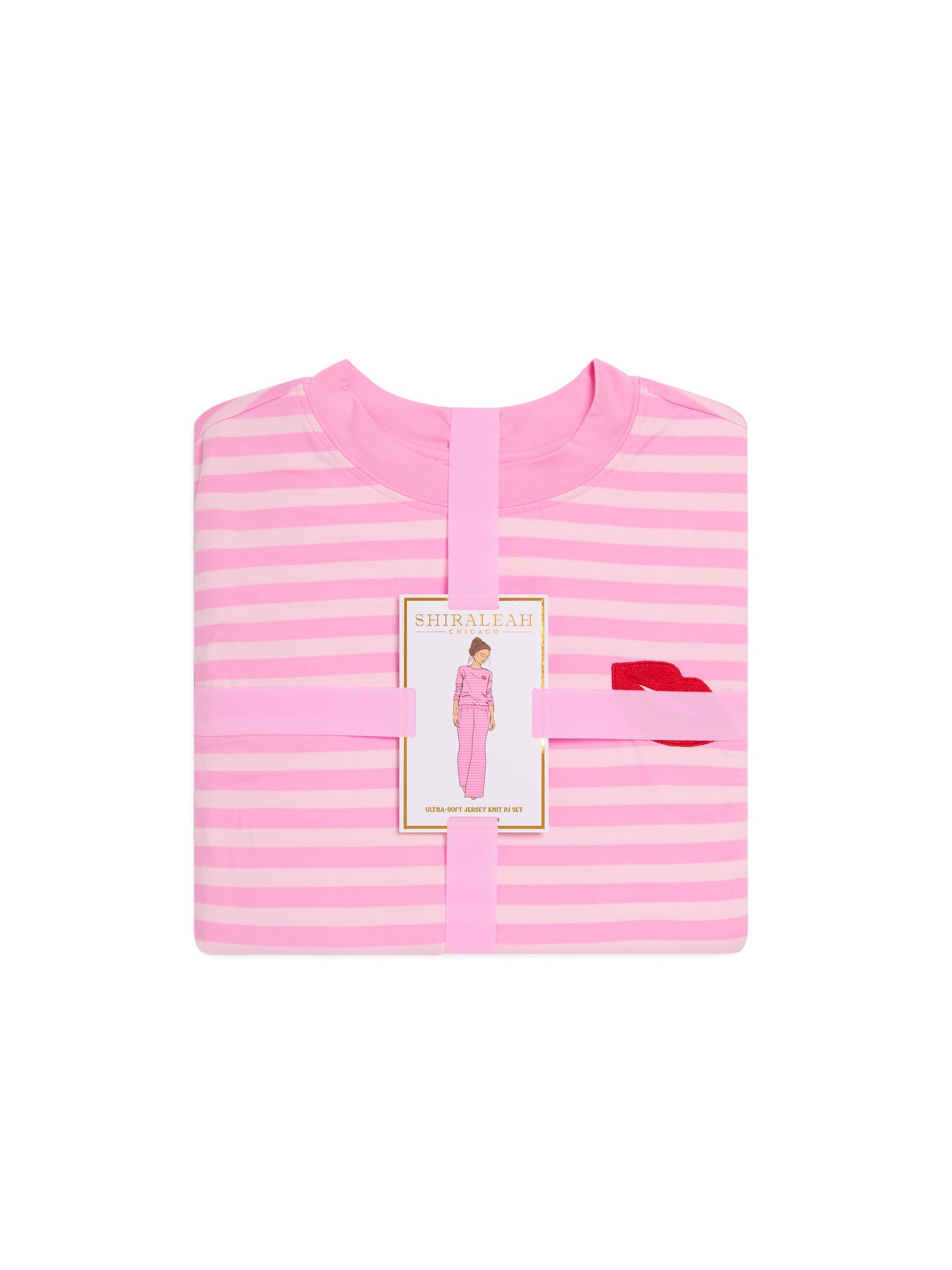 Say hello to sweet dreams in this Pink Stripe Ultra-Soft Jersey Knit PJ Set, made for lounging in total comfort and style. The relaxed fit top pairs perfectly with matching striped pants featuring a 29" inseam and convenient on-seam pockets. Crafted from a buttery-soft jersey knit, this set feels as good as it looks. With a flirty red lip accent on the chest and soft pink stripes throughout, it's your new favorite excuse to stay in.