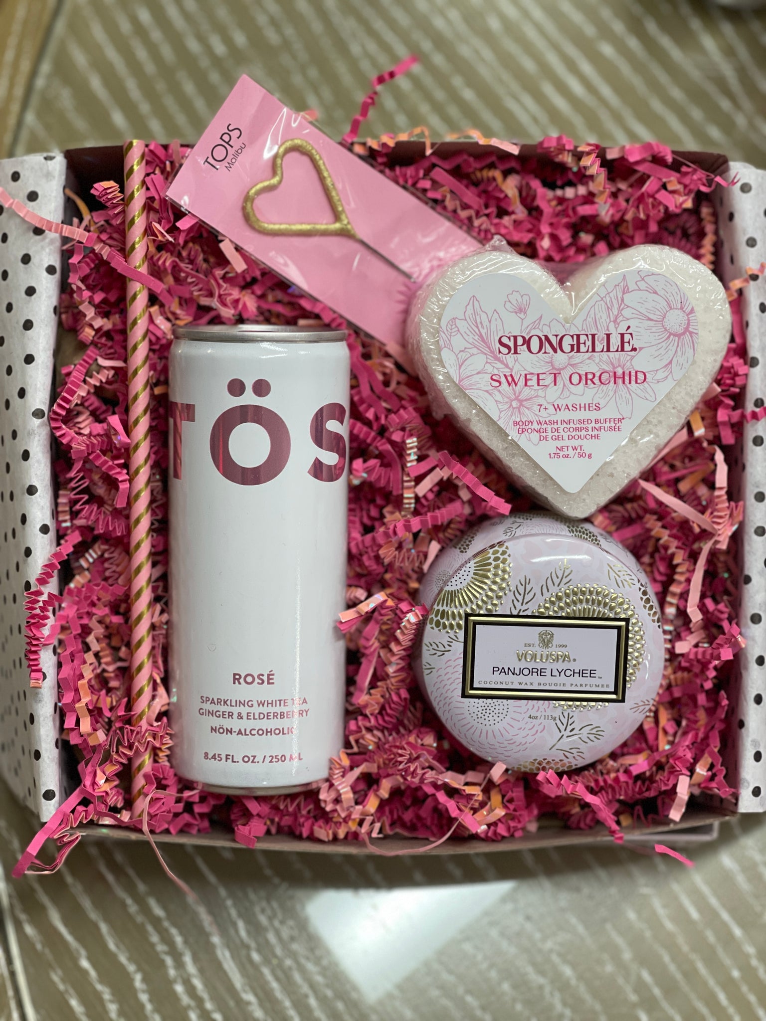 This pre-assembled Cultivated gift box is bubbly, vibrant, and a touch flirty. It includes our store's signature TOST sparkling (non-alcoholic) Rosé beverage in a pretty can, a Voluspa candle, a heart-shaped Spongelle body wash buffer, a heart-shaped sparkler, and a festive straw, all beautifully packaged in a white gift box, adorned with a pink ribbon.