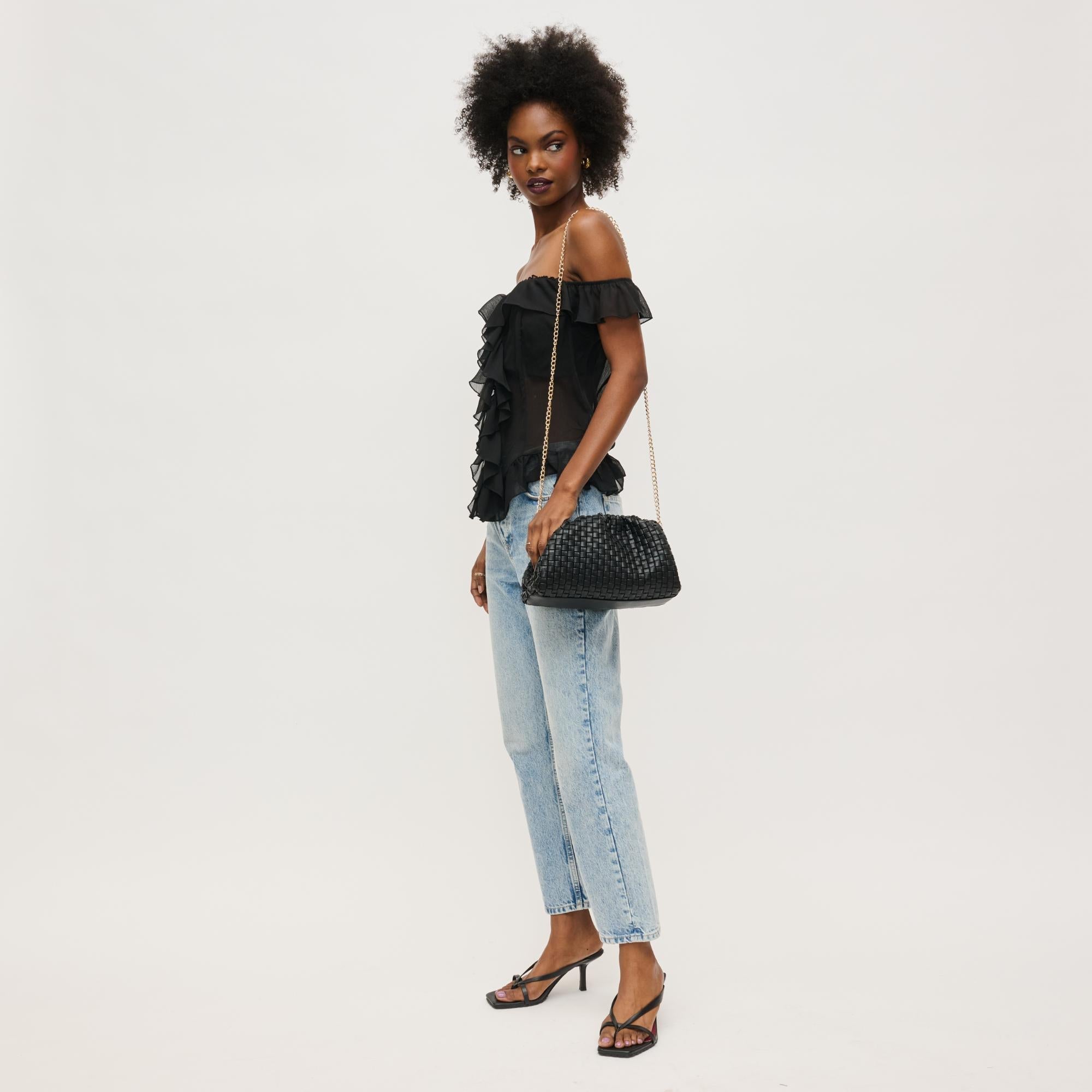 Meet your new date-night or girls' night bag!  It's also the perfect bag to snag before holiday season events. Featuring a unique woven texture, this chic bag offers a blend of contemporary design and timeless elegance. The versatile chain strap allows for seamless transitions from day to night. Crafted from vegan materials, without sacrificing style.