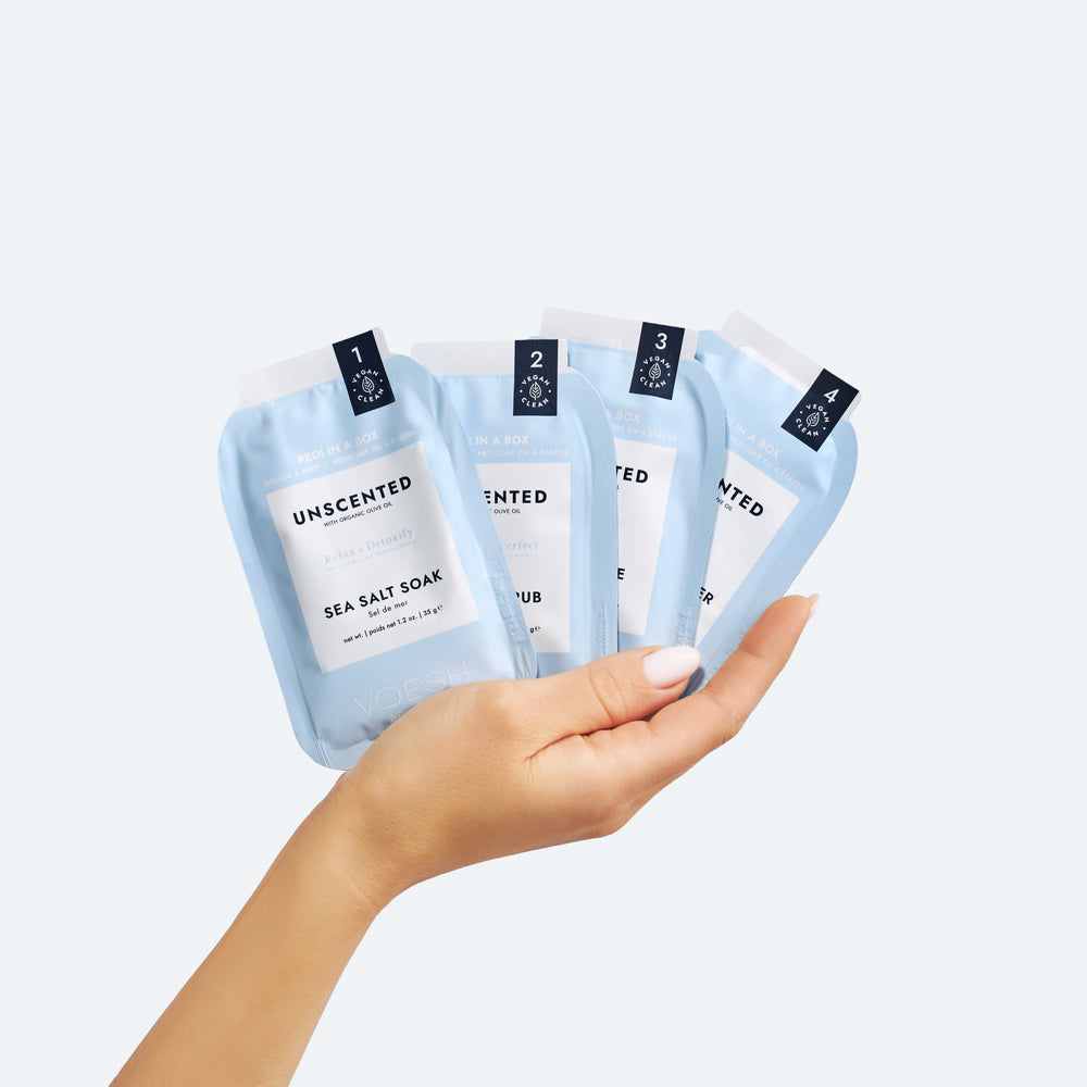 Enjoy a soothing spa experience with this single-use, 4-step Pedi in a Box set. Infused with organic virgin olive oil, the nourishing products hydrate skin and strengthen the moisture barrier. Plus, the unscented, clean formula is perfect for sensitive skin!