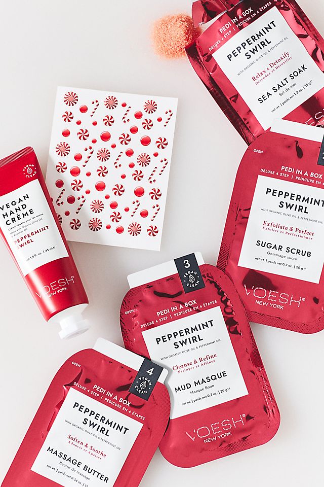 Get into the holiday spirit with our Peppermint Swirl Duo! This limited-edition set features the "Pedi in a Box Deluxe" 4 Step kit, a Vegan Hand Créme, and candy-cane nail stickers. You'll enjoy a pampering sea salt soak, sugar scrub, mud masque, and massage butter in an invigorating peppermint scent.